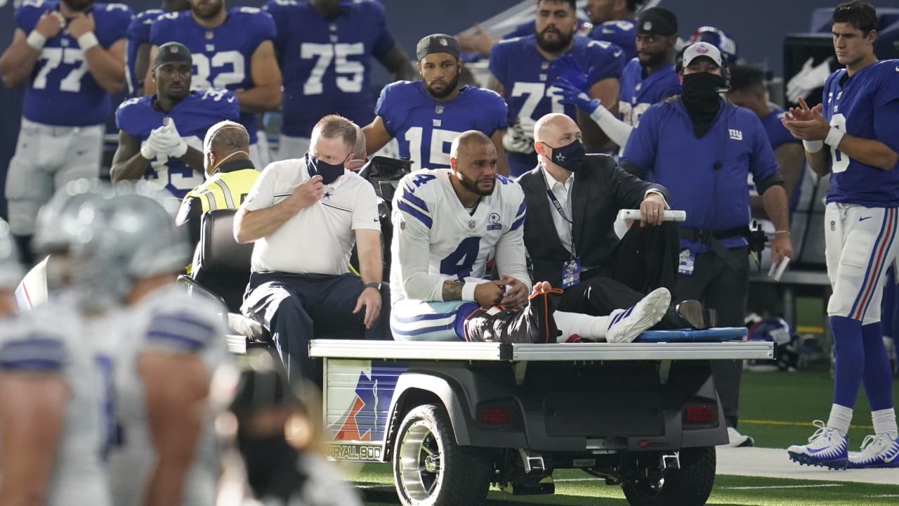 On what appeared to be a designed quarterback draw play on a first-and-10 from the New York 27, Prescott picked up nine yards but his lower right leg twisted awkwardly on a tackle by the Giants' Logan Ryan.